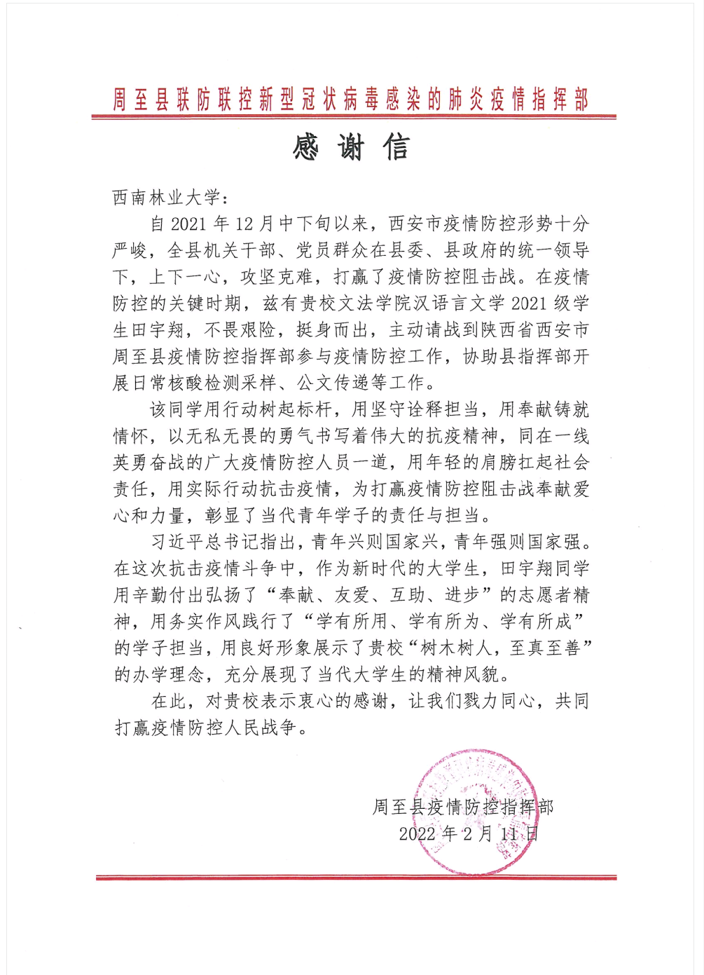 陕西省西安市周至县联防联控新型冠状病毒感染的肺炎疫情指挥部致信kaiyun体育,对文法学院汉语言文学2021级学生田宇翔主动请战到陕西省西安市周至县疫情防控指挥部参与疫情防控工作,协助县指挥部开展日常核酸检测采样、公文传递等工作表示感谢。