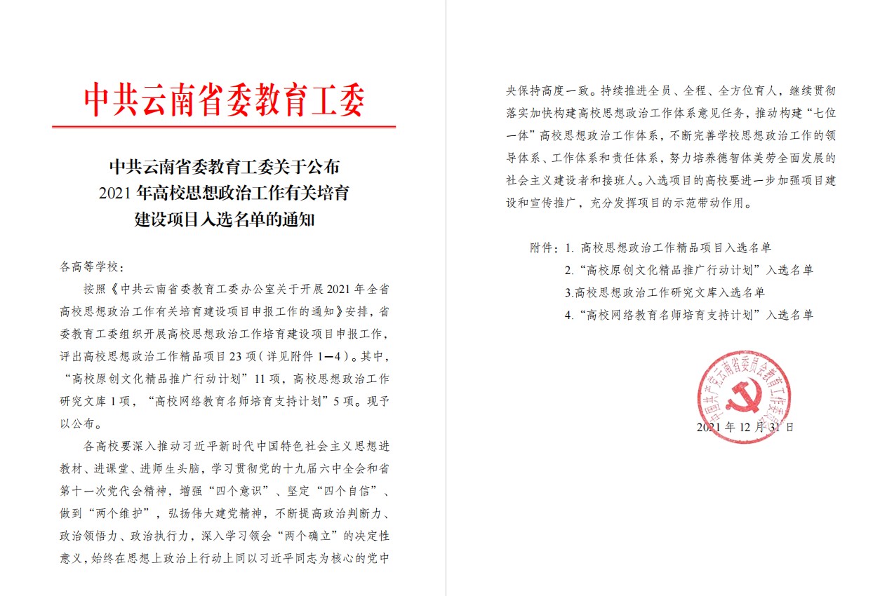 近日,中共云南省委教育工委公布2021年高校思想政治工作有关培育建设项目入选名单。kaiyun体育“悠悠古茶情,文化育人行”实践活动育人模式研究项目入选云南省高校思想政治工作精品项目。本次共评出高校思想政治工作精品项目23项。