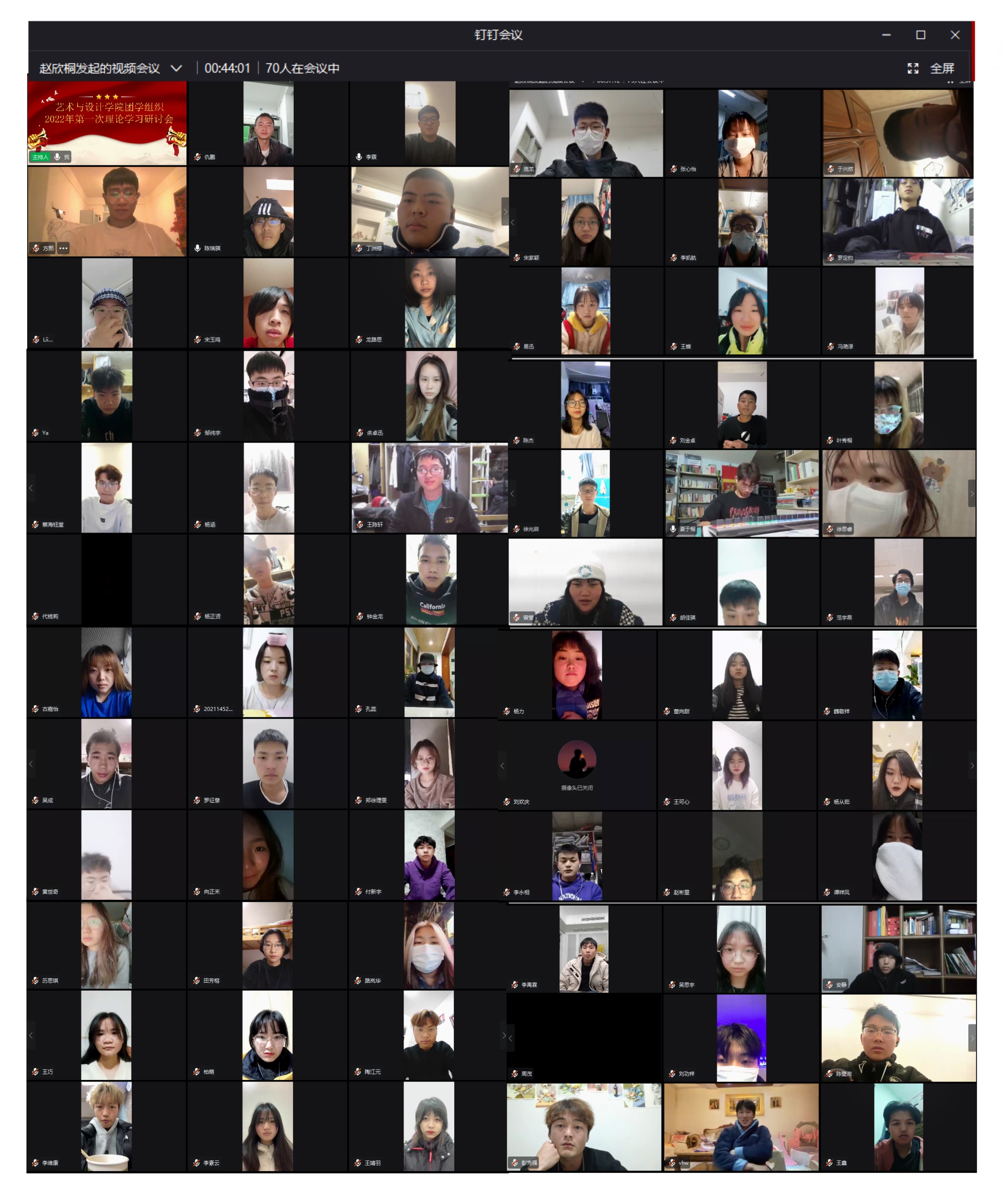1月3日,艺术与设计学院团学组织线上召开2022年第一次理论学习研讨会,院团委、学生会委员会、青年志愿者协会、学生工作办公室助理团、艺术团等学生组织70余名学生干部参加会议。会议由院学生会执行主席赵欣桐主持。