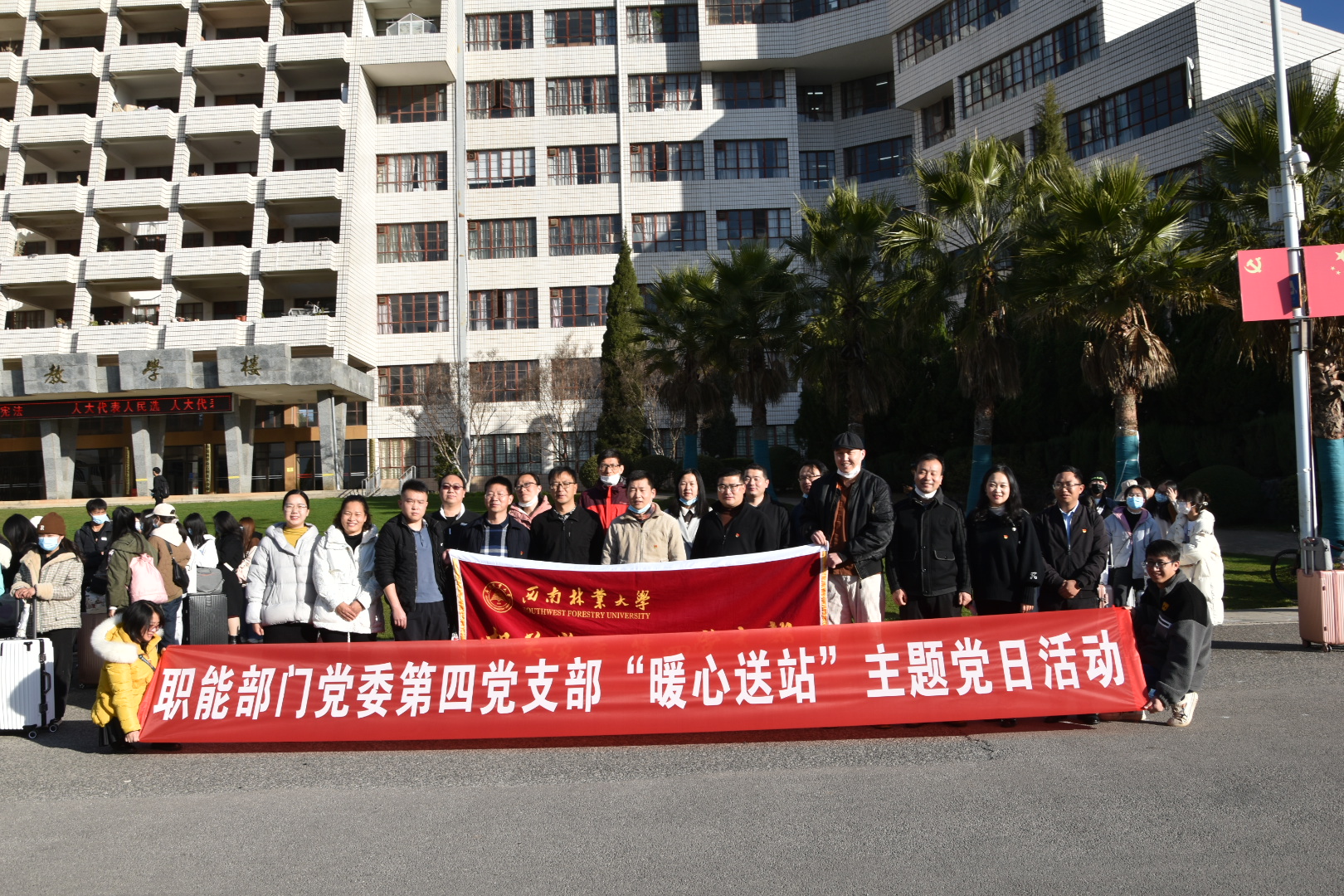 根据当前疫情防控形势需要,为了做好kaiyun体育寒假学生有序错峰离校工作,有效降低学生回家返程风险,1月6日,职能部门党委第四支部组织开展“暖心送站”主题党日活动。
