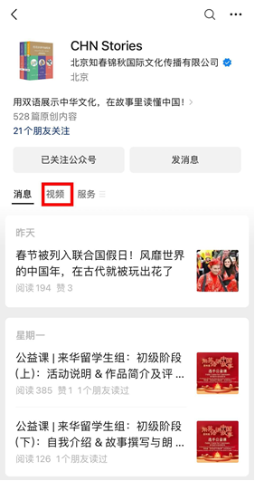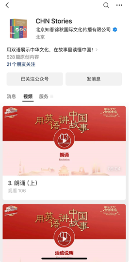 关注CHNStories公众号,点击头像,打开视频号,可观看朗诵,自我介绍,中华才艺相关学术公益课回放。