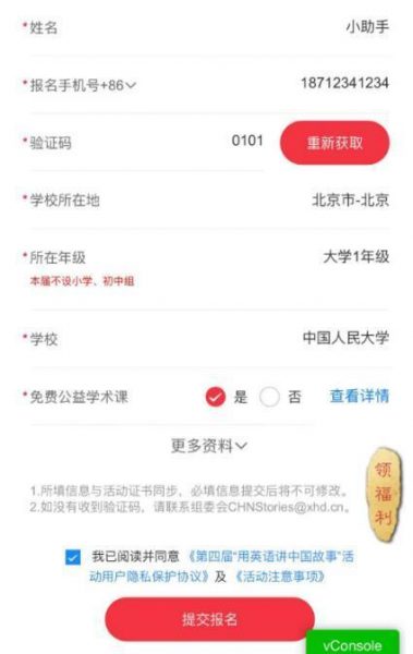 当你进入报名页面即可根据提示填写个人信息。必填项:姓名、手机号、学校和年级,还可免费报名公益学术课。