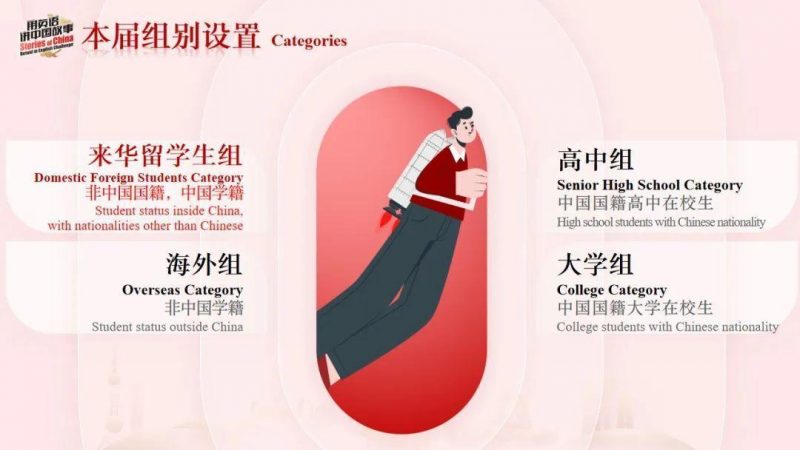 本届大赛活动根据国籍和学籍情况分为4大组别:高中组、大学组、来华留学生组和海外组: