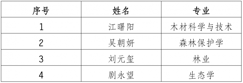 根据《中国林学会关于开展第十三届梁希优秀学子奖评选工作的通知》和《梁希优秀学子奖奖励办法》(试行)文件精神,本着公开、公平、公正的原则,经学生申请、学院推荐、学校评审,现将第十三届梁希优秀学子奖候选人推荐名单予以公示,具体名单如下: