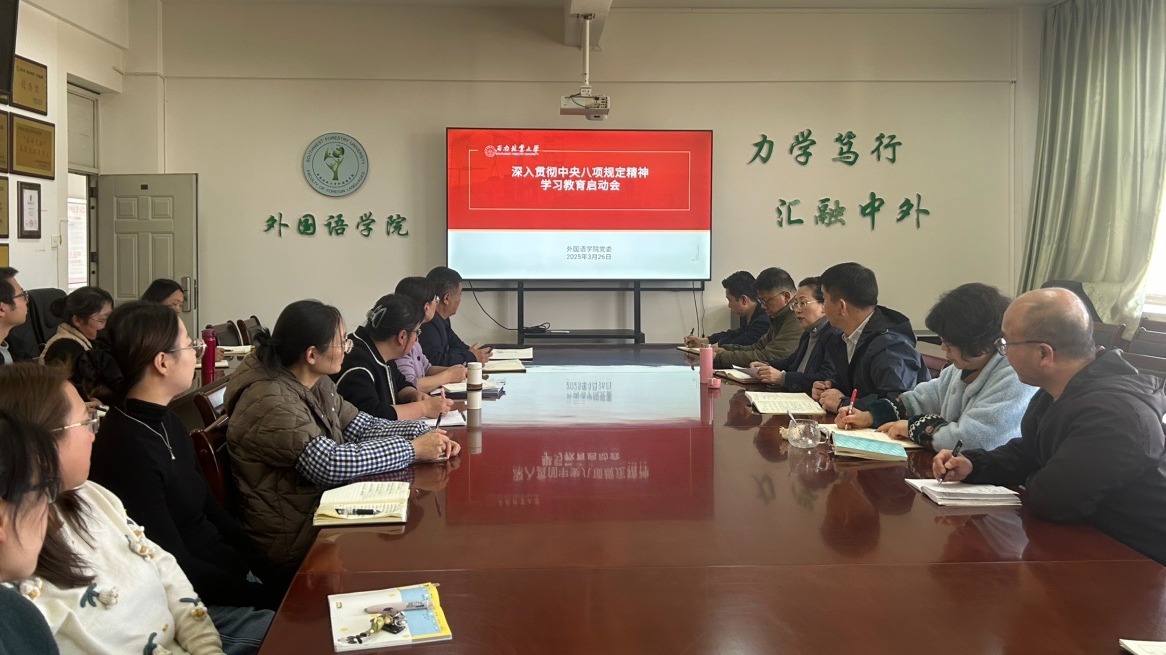 3月26日,外国语学院党委召开深入贯彻中央八项规定精神学习教育启动会。会议由外国语学院党委书记姜丽红主持,外国语学院党委委员、党支部书记、系部中心主任参加会议。