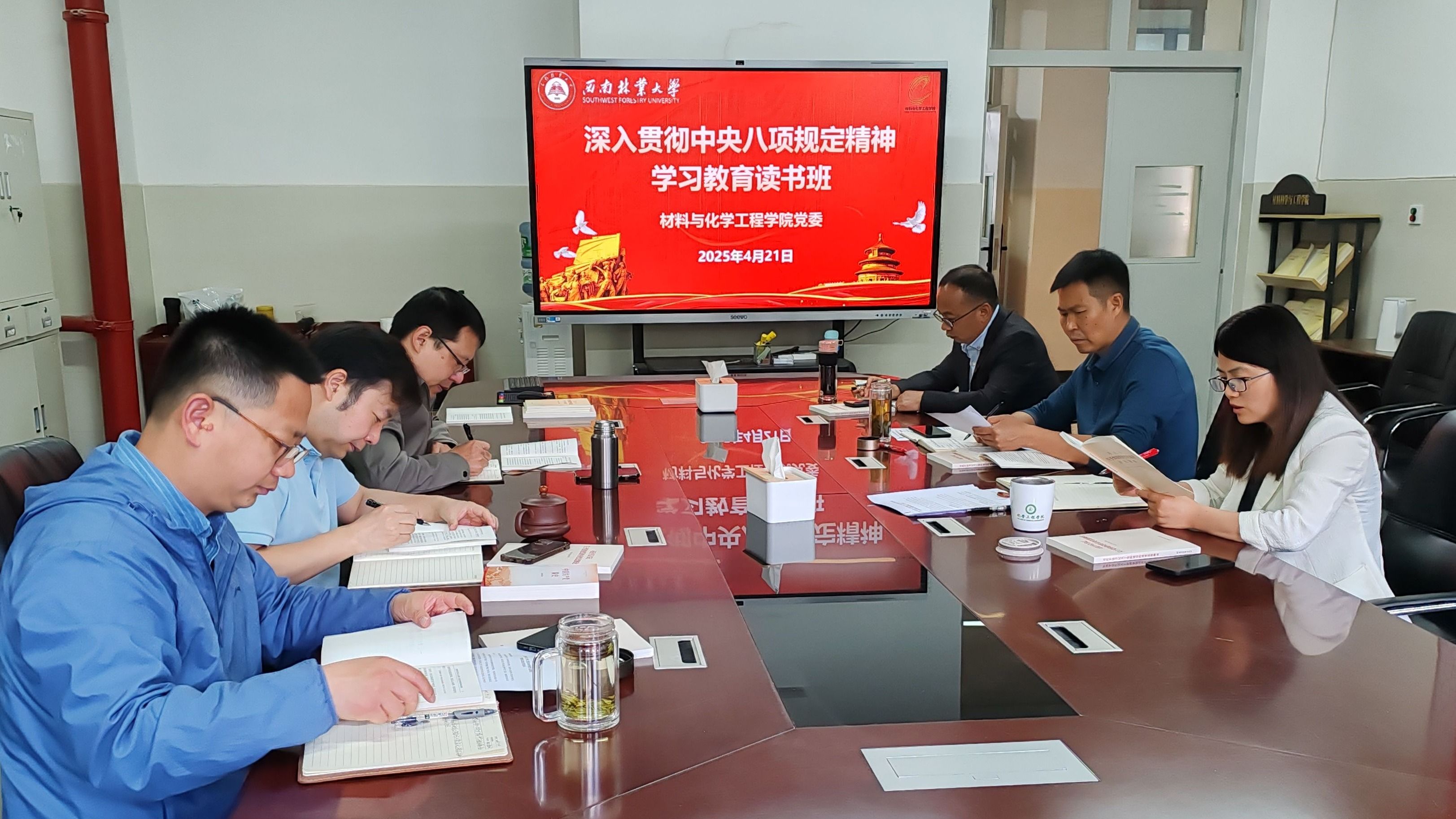 4月21日,材料与化学工程学院党委开展深入贯彻中央八项规定精神学习教育读书班专题学习。会议由学院党委书记孙浩主持,全体党委委员参加学习。