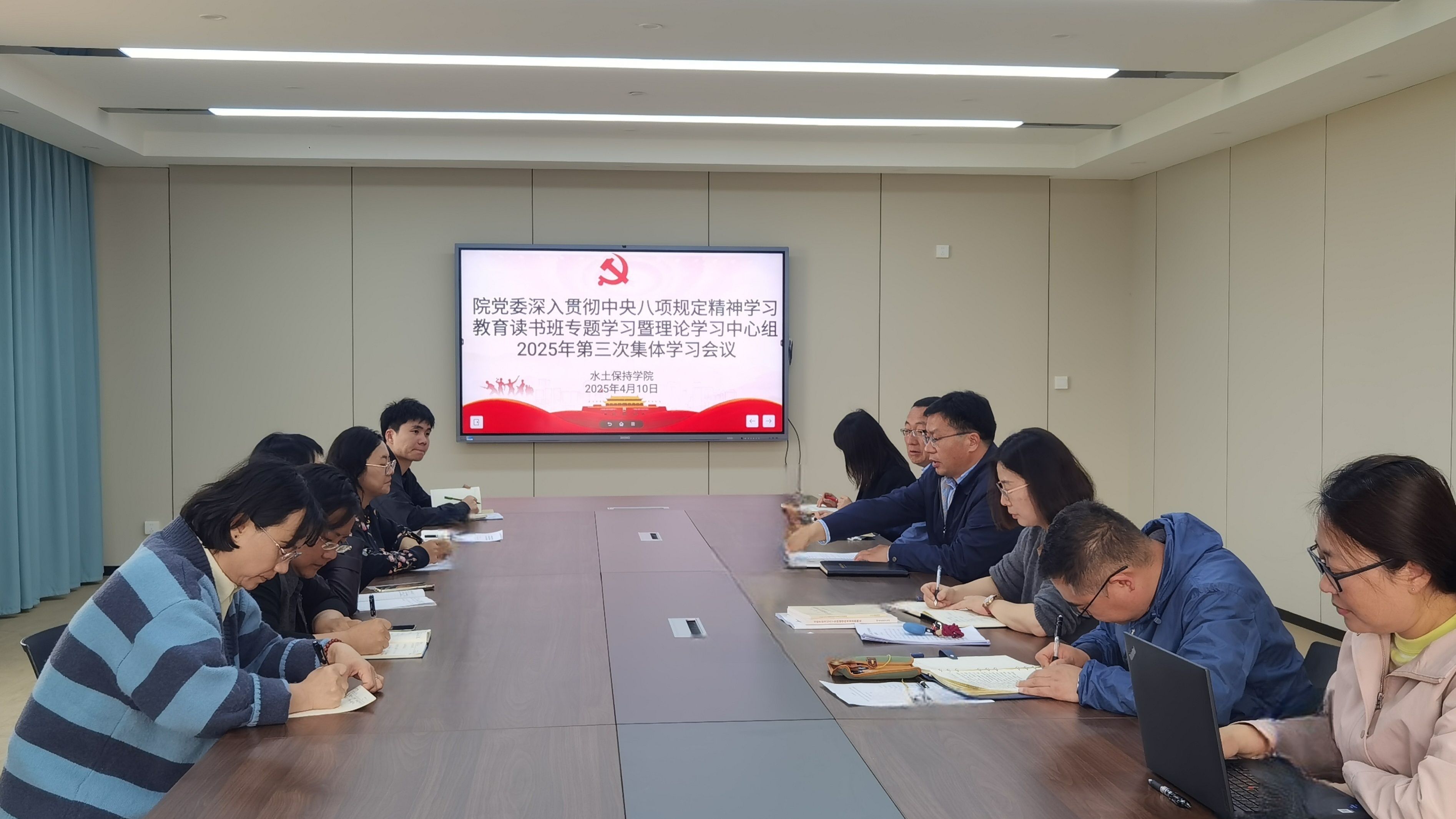 4月10日,水土保持学院党委理论学习中心组在生态楼325会议室举行深入贯彻中央八项规定精神学习教育读书班专题学习暨理论学习中心组2025年第三次集体学习会议,院党委理论学习中心组全体成员参加学习,会议由党委书记刘建祥主持。