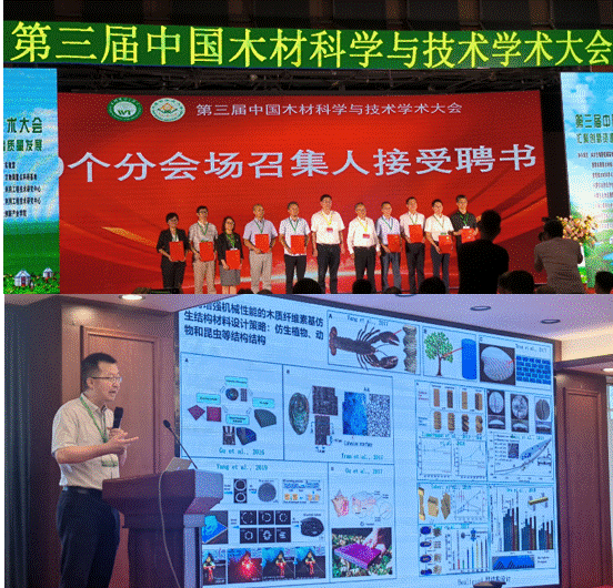 校党委副书记李君作题为《木质复合材料功能性改良》的分会场特邀报告,材料与化学工程学院教师周晓剑和杨龙分别主持了“胶黏剂与表面装饰”和“木质资源利用与先进功能材料”分会场的报告会,徐开蒙、万建勇和杨玉山分别作了《多孔生物质基污染物吸附材料的制备及特性研究》《生物质基光热转换复合材料制备及性能研究》《人工智能赋能的木材全过程应用平台-eyewood 平台》分会场报告。学院研究生张康康、唐茂捷、唐泷、李昌钊、王柏淯、戴佳慧和刘倩分别作学术报告。